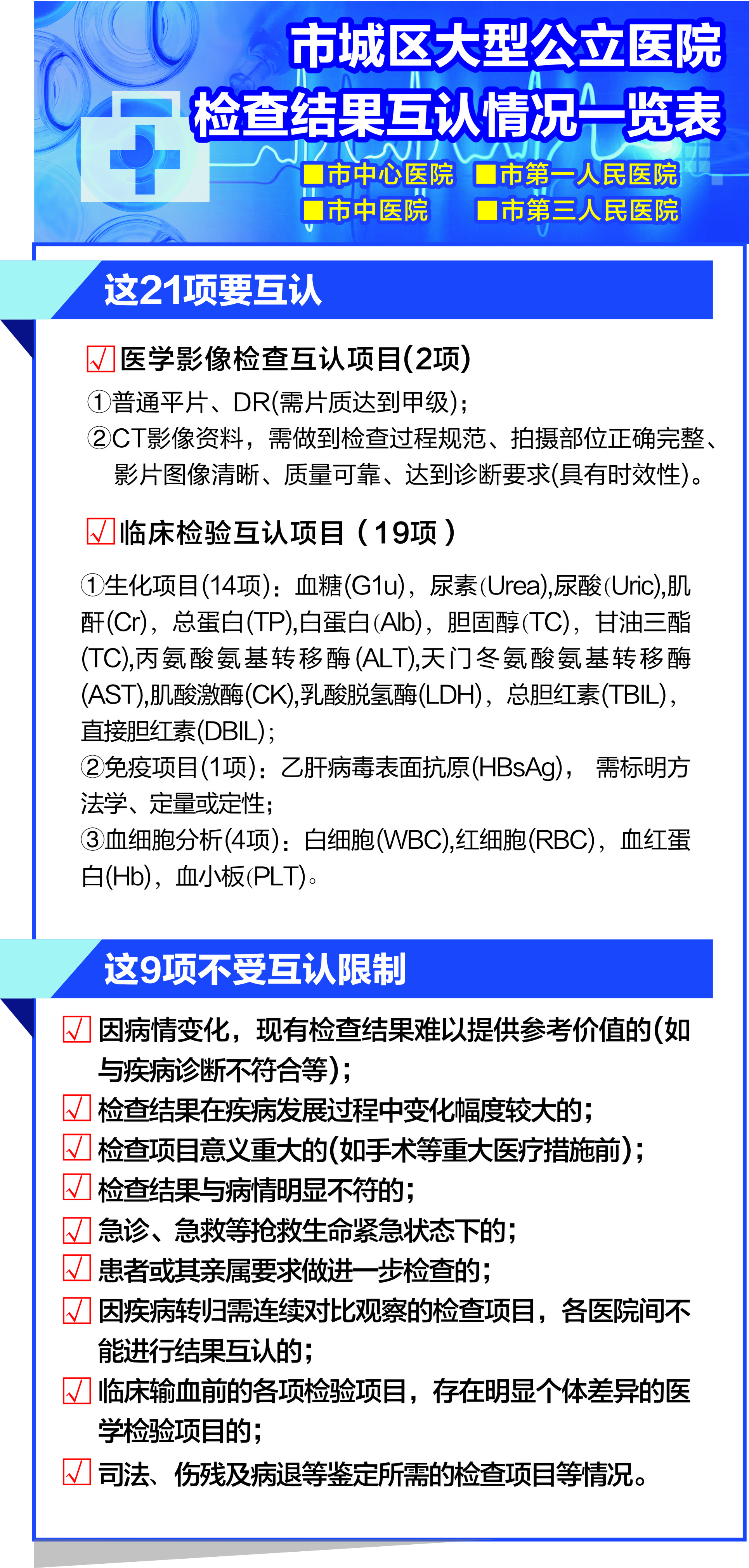 | 医院检查结果互认一直是群众所愿。"市城区大型公立医院部分检查不合理、检查结果不互认"被纳入遂宁市2020年度"群众最不满意的10件事",经过一段时间的整治,这个问题是否已经得到解决? 5月7日,在走访中了解到,4月底,市卫生健康委、市医保局联合出台《整治"市城区大型公立医院部分检查不合理 检查结果不互认问题"实施方案》的通知,通知明确检查互认项目和不受互认限制情形。目前,市城区各大医院正在对标通知要求自查自纠,市城区大型公立医院检查不合理现象得到明显改观。 联合发文 21项检查结果要互认 "通过前期的走访、摸排,我们对群众所反应的市城区大型公立医院部分检查不合理、检查结果不互认问题进行了深入调查,近日,市卫生健康委和市医疗保障局联合发文,对这一问题进行集中整治。"市卫生健康委医政科科长陈海军介绍。 据了解,此次整治行动主要针对市中心医院、市中医院、市第一人民医院、市第三人民医院。为整治市城区大型公立医院部分检查不合理的问题,市卫生健康委提出明确要求,要求各个医院要加强专业培训,提高诊疗水平;开展医嘱点评,规范合理检查;狠抓医德医风教育,树立良好形象;多手段开展督导检查,严肃惩处违规行为;开展满意度测评,提升优质服务能力。 "今后,老百姓在市城区大型公立医院接受治疗,共有21项检查结果医院互认。但必须满足一个前提条件,医学影像检查和临床检验结果互认医院为全省二级及以上医疗机构,大型医疗设备(CT)阳性检查率达80%以上的医院,需参加市级及以上室间质评且成绩合格。"陈海军说。据悉,医院互认检查结果涉及医学影像检查互认项目及临床检验互认项目,共计21项。 其中,医学影像检查互认项目包括:普通平片、DR(需片质达到甲级);CT影像资料,需做到检查过程规范、拍摄部位正确完整、影片图像清晰、质量可靠、达到诊断要求(具有时效性)。临床检验互认项目包括:生化项目14项即血糖(G1u),尿素(Urea),尿酸(Uric),肌酐(Cr),总蛋白(TP),白蛋白(Alb),胆固醇(TC),甘油三酯(TC),丙氨酸氨基转移酶(ALT),天门冬氨酸氨基转移酶(AST),肌酸激酶(CK),乳酸脱氢酶(LDH),总胆红素(TBIL),直接胆红素(DBIL);免疫项目1项即乙肝病毒表面抗原(HBsAg),需标明方法学、定量或定性;血细胞分析4项即白细胞(WBC),红细胞(RBC),血红蛋白(Hb),血小板(PLT)。