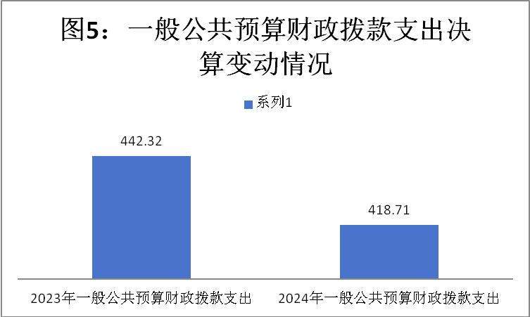 2024年度一般公共预算财政拨款支出418.71万元,占本年支出合计的97%。与2023年度相比,一般公共预算财政拨款支出减少23.61万元,下降5.34%。主要变动原因是:人员减少(退休2人),人员工资和社保缴费相应的收入和支出减少。