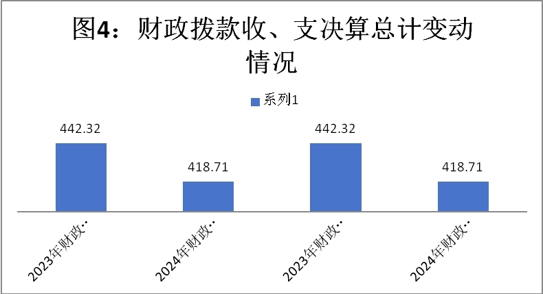 2024年度财政拨款收、支总计均为418.71万元。与2023年度相比,财政拨款收、支总计各减少23.61万元,下降5.34%。主要变动原因是:人员减少(退休2人),人员工资和社保缴费相应的收入和支出减少。