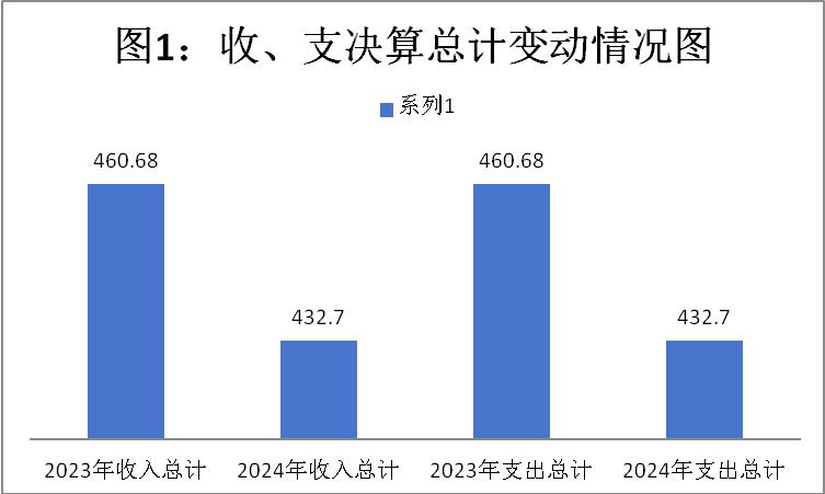 2024年度收、支总计均为432.7万元。与2023年度相比,收、支总计各减少27.98万元,下降6.07%。主要变动原因是:1、人员减少(退休2人),人员工资和社保缴费相应的收入和支出减少。2、学生人数减少,课后服务收入和支出相应减少。