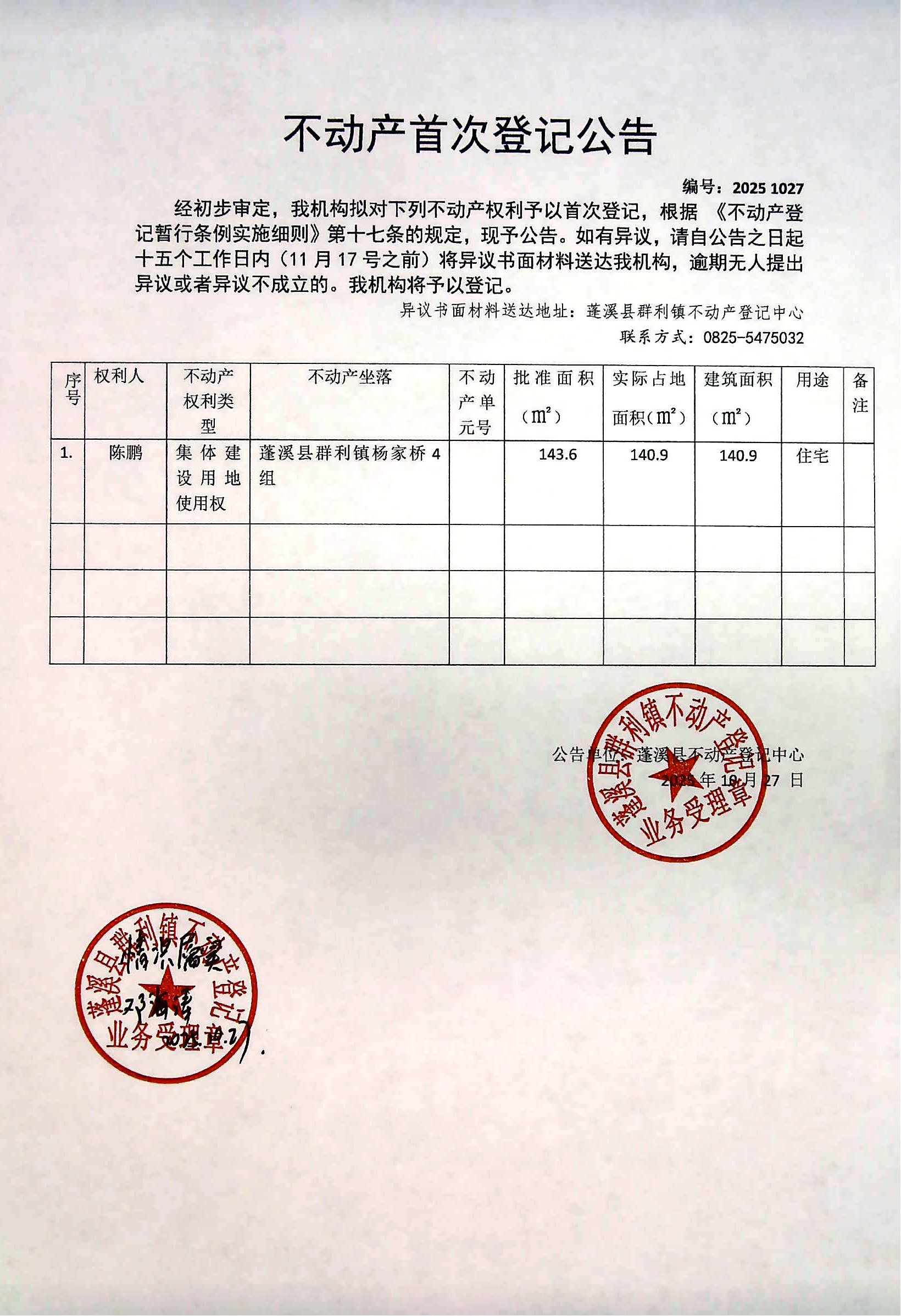 首次登记公告(陈鹏)