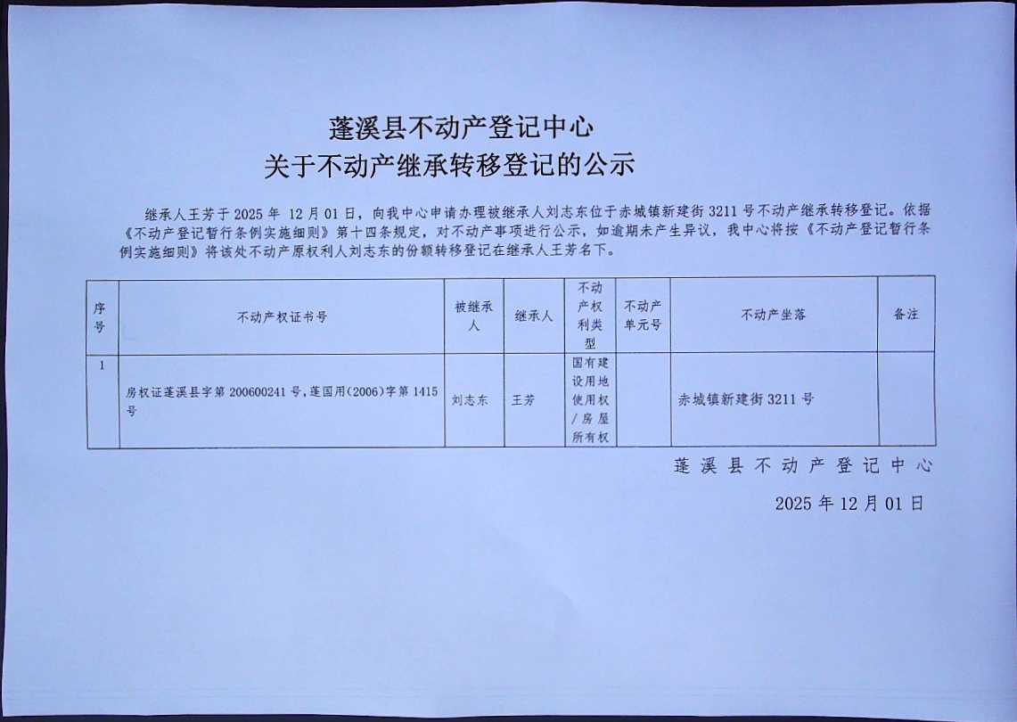 继承转移登记公告(王芳)