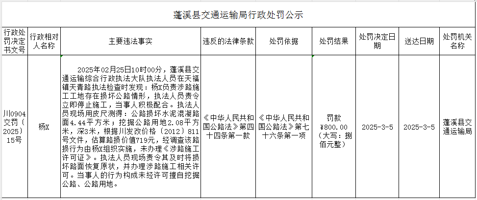 蓬溪县交通运输局行政处罚公示