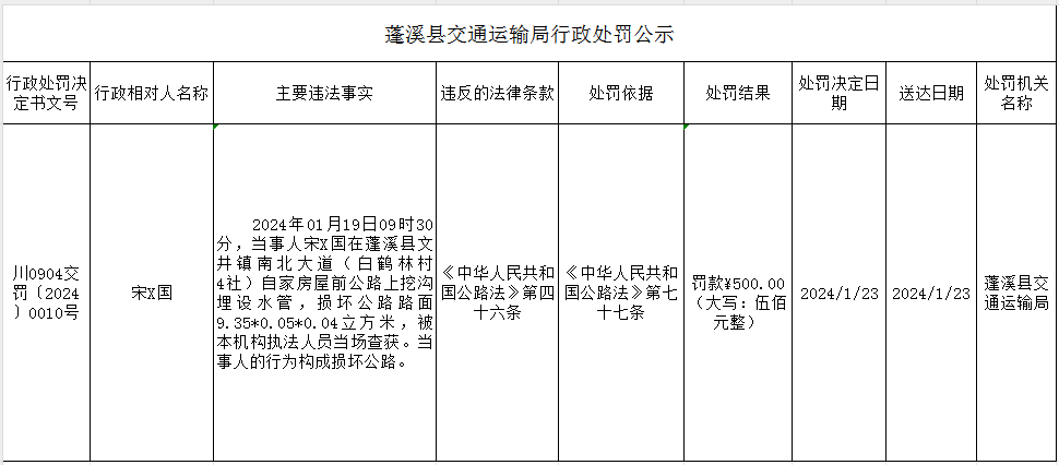 蓬溪县交通运输局行政处罚公示