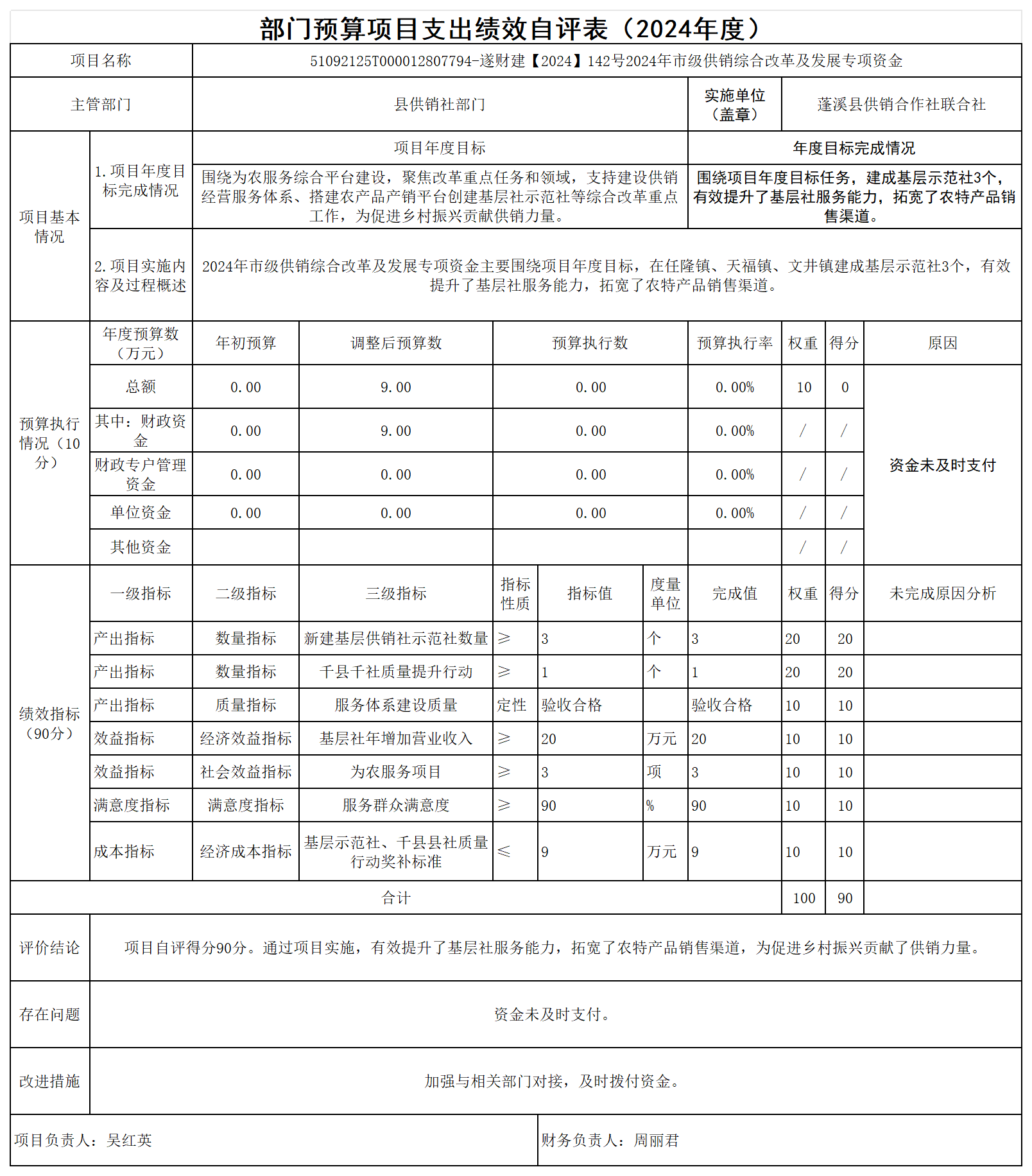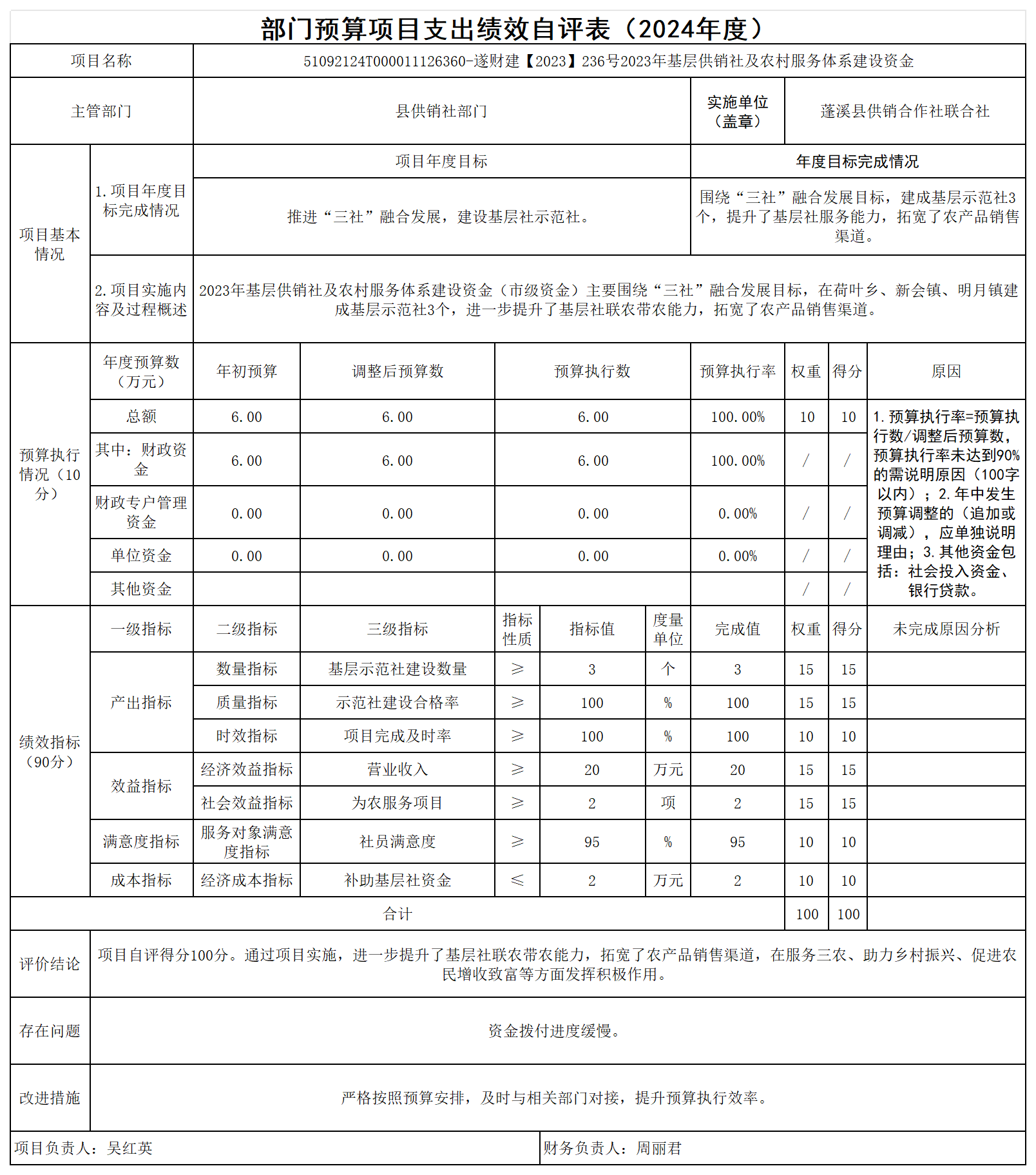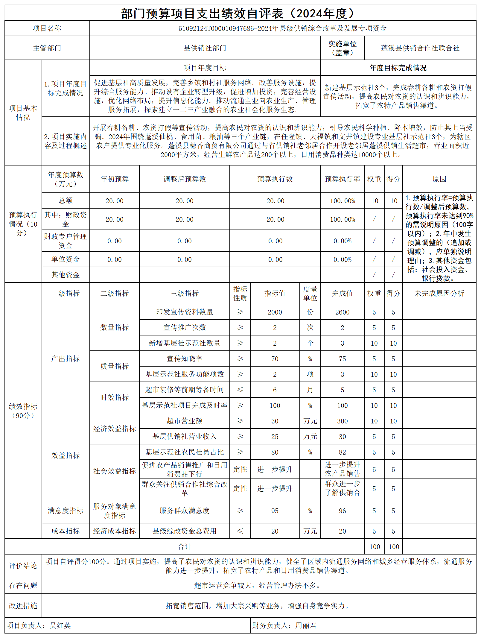 组织对2024年度一般公共预算、政府性基金预算、国有资本经营预算、社会保险基金预算以及资本资产、债券资金等全面开展绩效自评,形成供销社部门整体(含部门预算项目)绩效自评报告、老邻居蓬溪供销生活超市建设项目自评报告、2024年项目前期经费专项预算项目支出绩效自评报告,其中,供销社部门整体(含部门预算项目)绩效自评得分为94.93分,绩效自评综述:我社各项目资金主要用于确保单位的正常运转,促进各项工作顺利进行。基本支出、项目支出严格执行县委、县政府的各项制度,在保证各项任务的顺利完成的同时,严格落实厉行节约的原则。根据县财政局下发的部门整体支出绩效评价指标体系确定的内容,进行了全面综合评价,从评价结果来看,预算编制数据准确,无随意调整预算的情况,各项收支均纳入预算管理,总体绩效良好。老邻居蓬溪供销生活超市建设项目绩效自评得分为100分,绩效自评综述:该项目由蓬溪县穗满供销有限公司作为投资和建设主体,于2024年2月按照相关程序通过招投标确定施工企业进行建设。超市位于蓬溪县普安街道紫御中央一楼,总面积2000平方米,于2024年4月30日完成建设任务,于2024年5月10日开业运营。超市建成投运后,进一步健全区域内流通服务网络和城乡经营服务体系,经济效益、社会效益、生态效益、民生效益得到了发挥较好,实现了项目预期目标。2024年项目前期经费专项预算项目绩效自评得分为100分,绩效自评综述:该项目以提升供销为农服务综合能力为根本,不断建强服务体系、提升服务能力、完善服务机制,充分发挥供销社在加强县域流通体系和城乡经营服务体系等方面的积极作用。项目建成后提高了为农服务质量和效率,农产品和日用消费品流通得到了有效地带动促进和提升,增加了就业岗位。