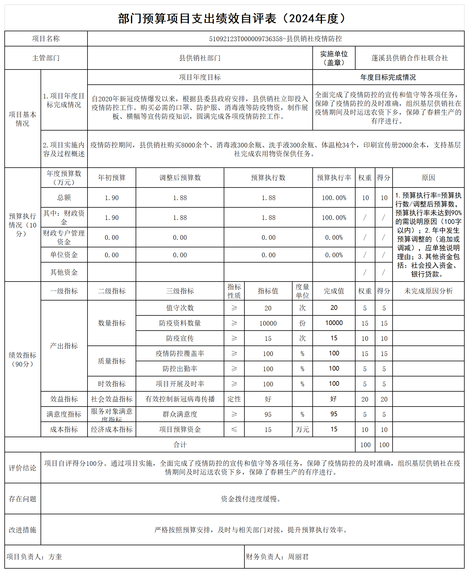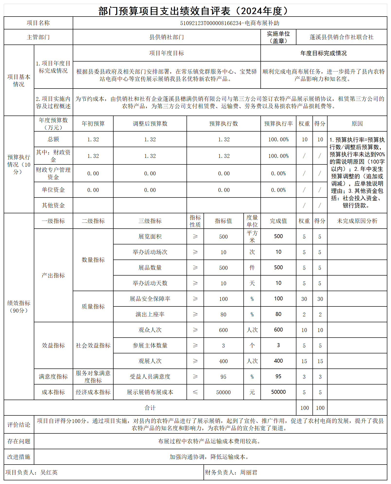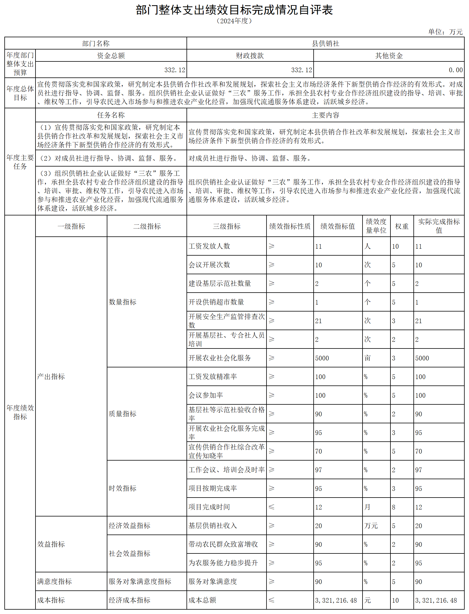 组织对2024年度一般公共预算、政府性基金预算、国有资本经营预算、社会保险基金预算以及资本资产、债券资金等全面开展绩效自评,形成供销社部门整体(含部门预算项目)绩效自评报告、老邻居蓬溪供销生活超市建设项目自评报告、2024年项目前期经费专项预算项目支出绩效自评报告,其中,供销社部门整体(含部门预算项目)绩效自评得分为94.93分,绩效自评综述:我社各项目资金主要用于确保单位的正常运转,促进各项工作顺利进行。基本支出、项目支出严格执行县委、县政府的各项制度,在保证各项任务的顺利完成的同时,严格落实厉行节约的原则。根据县财政局下发的部门整体支出绩效评价指标体系确定的内容,进行了全面综合评价,从评价结果来看,预算编制数据准确,无随意调整预算的情况,各项收支均纳入预算管理,总体绩效良好。老邻居蓬溪供销生活超市建设项目绩效自评得分为100分,绩效自评综述:该项目由蓬溪县穗满供销有限公司作为投资和建设主体,于2024年2月按照相关程序通过招投标确定施工企业进行建设。超市位于蓬溪县普安街道紫御中央一楼,总面积2000平方米,于2024年4月30日完成建设任务,于2024年5月10日开业运营。超市建成投运后,进一步健全区域内流通服务网络和城乡经营服务体系,经济效益、社会效益、生态效益、民生效益得到了发挥较好,实现了项目预期目标。2024年项目前期经费专项预算项目绩效自评得分为100分,绩效自评综述:该项目以提升供销为农服务综合能力为根本,不断建强服务体系、提升服务能力、完善服务机制,充分发挥供销社在加强县域流通体系和城乡经营服务体系等方面的积极作用。项目建成后提高了为农服务质量和效率,农产品和日用消费品流通得到了有效地带动促进和提升,增加了就业岗位。