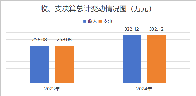 2024年度收、支总计均为332.12万元。与2023年度相比,收、支总计各增加74.04万元,上升28.69%。主要变动原因是增加了老邻居蓬溪供销生活超市项目。