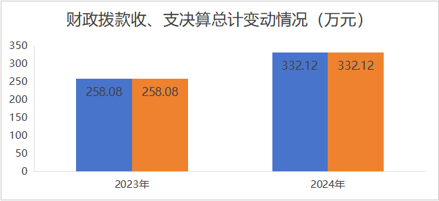2024年度财政拨款收、支总计均为332.12万元。与2023年度相比,财政拨款收、支总计各增加74.04万元,上涨28.69%。主要变动原因是增加了老邻居蓬溪供销生活超市项目。