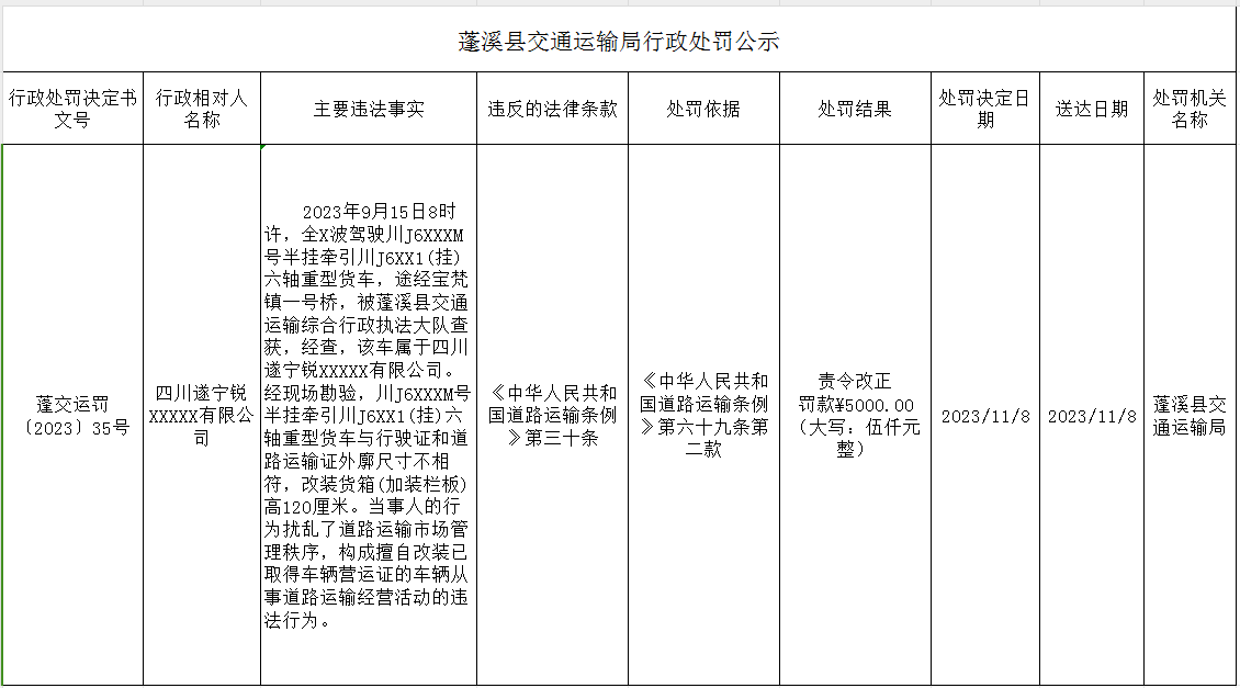 蓬溪县交通运输局行政处罚公示
