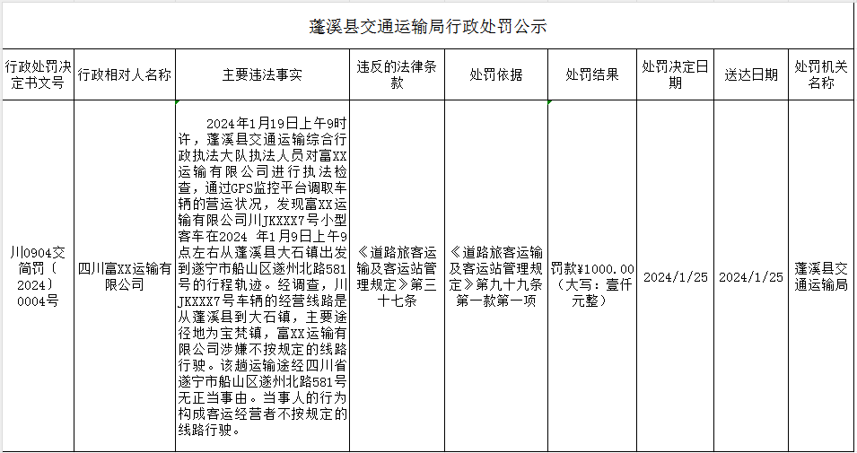 蓬溪县交通运输局行政处罚公示