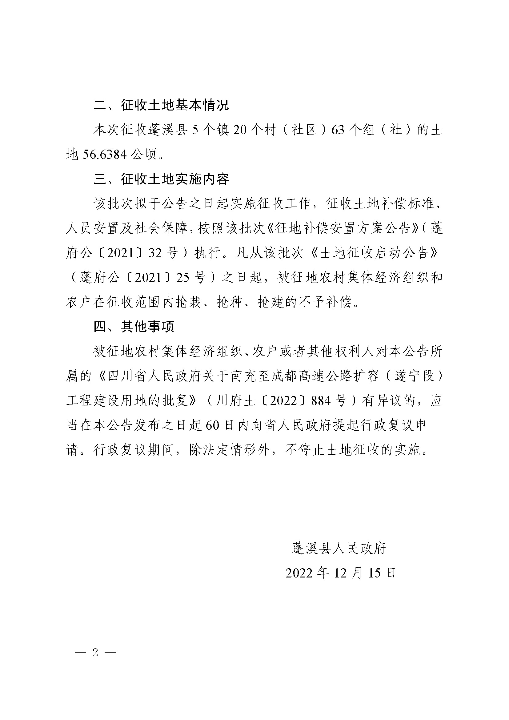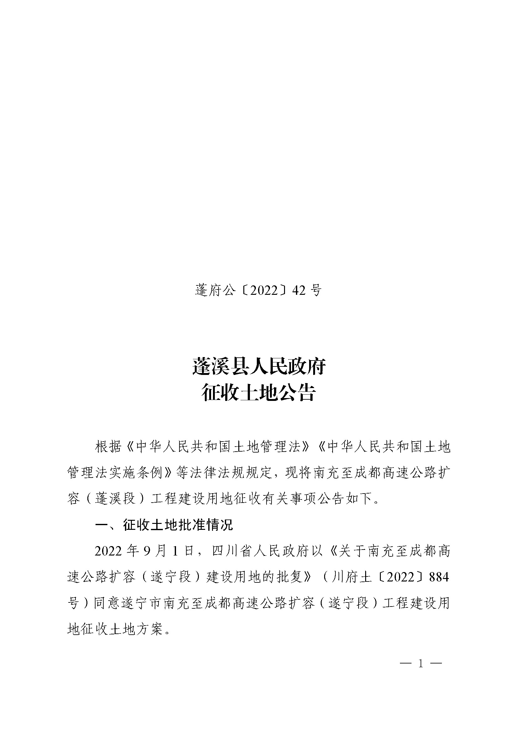 蓬溪县人民政府征收土地公告(蓬府公【2022】42号)