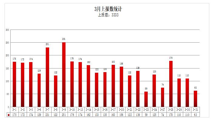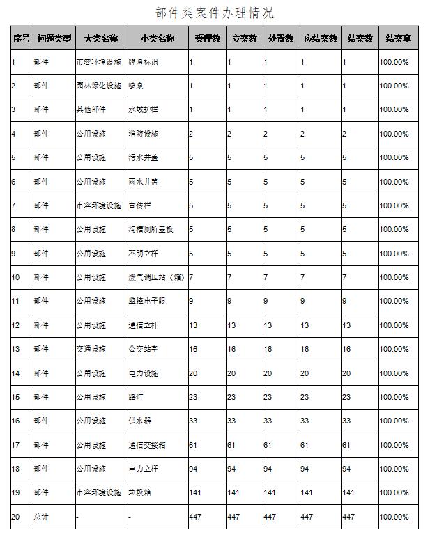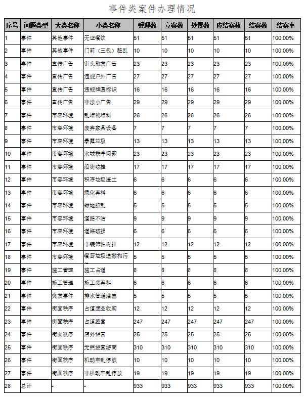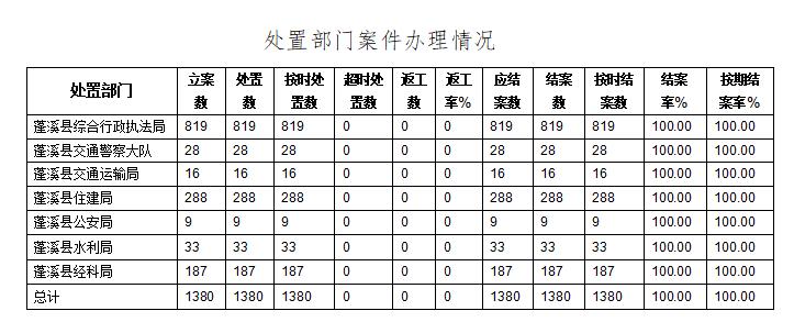 蓬溪县数字城管2023年3月共上报3333件。其中信息采集上报1384件,自行处置上报1949件。立案1380件,事件类立案933件,部件类立案447件。已处置1380件,应结案1380件,结案1380件,结案率100%,按期结案1380件,按期结案率100%。