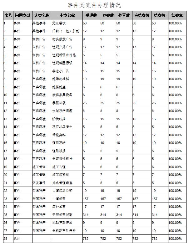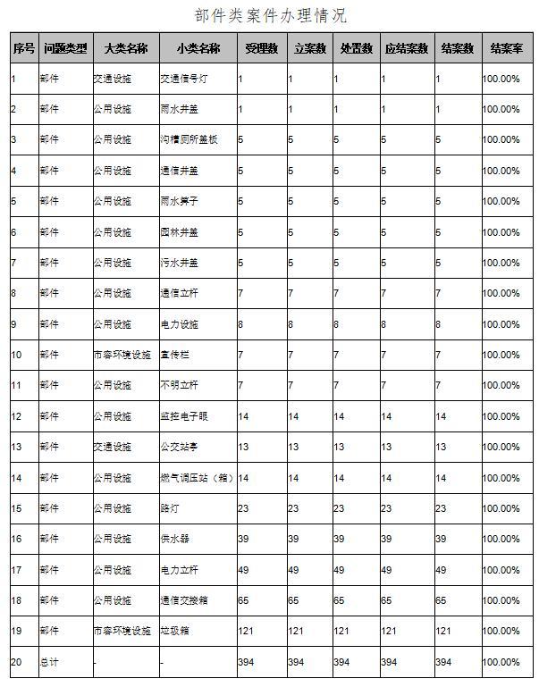 蓬溪县数字城管2023年4月共上报2920件。其中信息采集上报1177件,自行处置上报1743件。立案1176件,已处置1176件,处置率100%,应结案1176件,结案1176件,结案率100%,按期结案1176件,按期结案率100%。本月立案的事件类案件782件,主要集中在街面秩序、市容环境、宣传广告三大类;立案的部件类案件394件,主要集中在公用设施、市容环境设施、交通设施三大类。