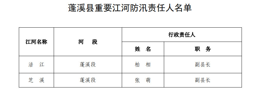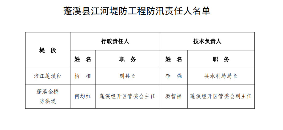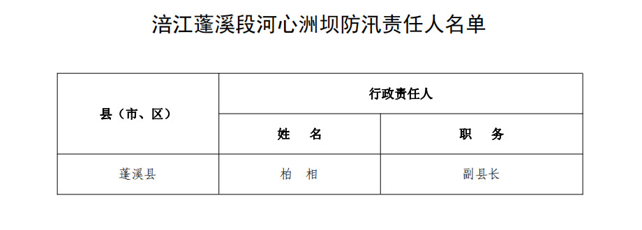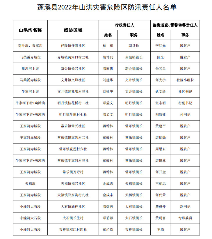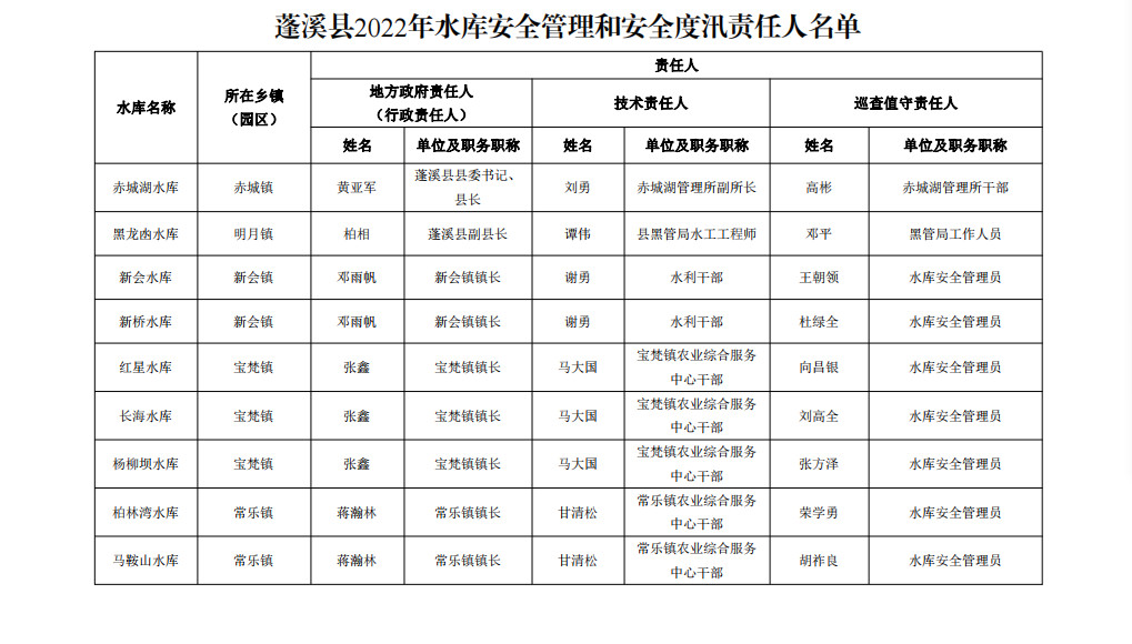 为切实做好 2022 年防汛抗旱工作,根据《中华人民共和国防洪法》《国务院关于特大安全事故行政责任追究的规定》和《国家防总关于<各级地方人民政府行政首长防汛工作职责>的规定》等,现将2022年度全县重要江河、堤防、河心洲坝、城镇、山洪灾害危险区、在建重点水利工程及水库防汛和抗旱责任人名单通报如下。