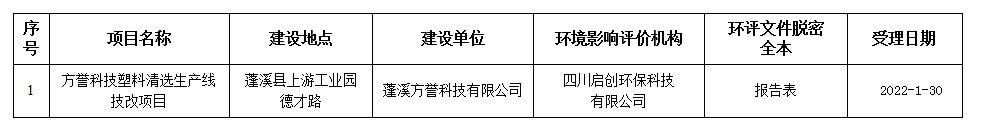 根据建设项目环境影响评价审批程序的有关规定,2022年1月26日我局受理1个建设项目环境影响评价文件。现将受理情况予以公告。如有建议意见,请于2022年1月30日(五个工作日)前向我局提出。