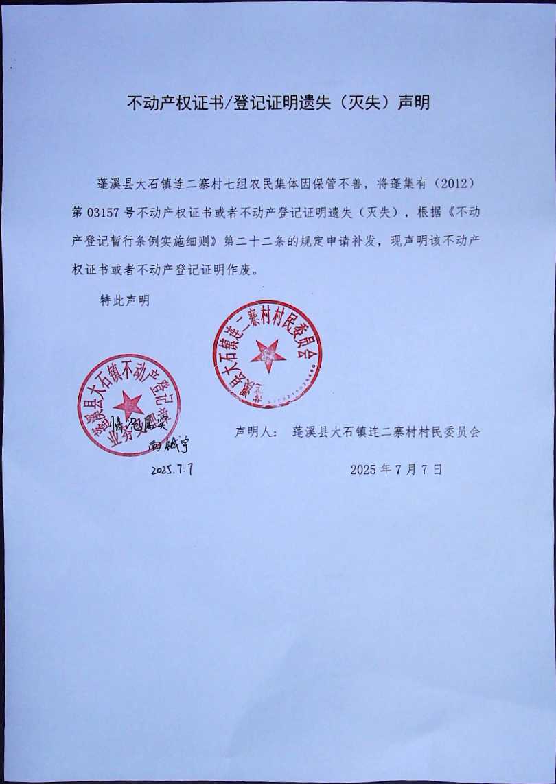 遗失补证公告(蓬溪县大石镇连二寨村七组农民集体)