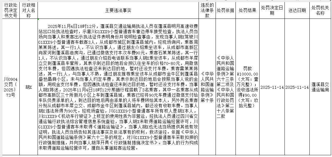 蓬溪县交通运输局行政处罚公示