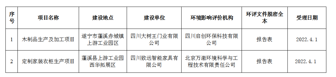 根据建设项目环境影响评价审批程序的有关规定,2022年4月1日我局受理2个承诺制建设项目环境影响评价文件。现将受理情况予以公告。如有建议意见,请于2022年4月12日(七个工作日)前向我局提出。