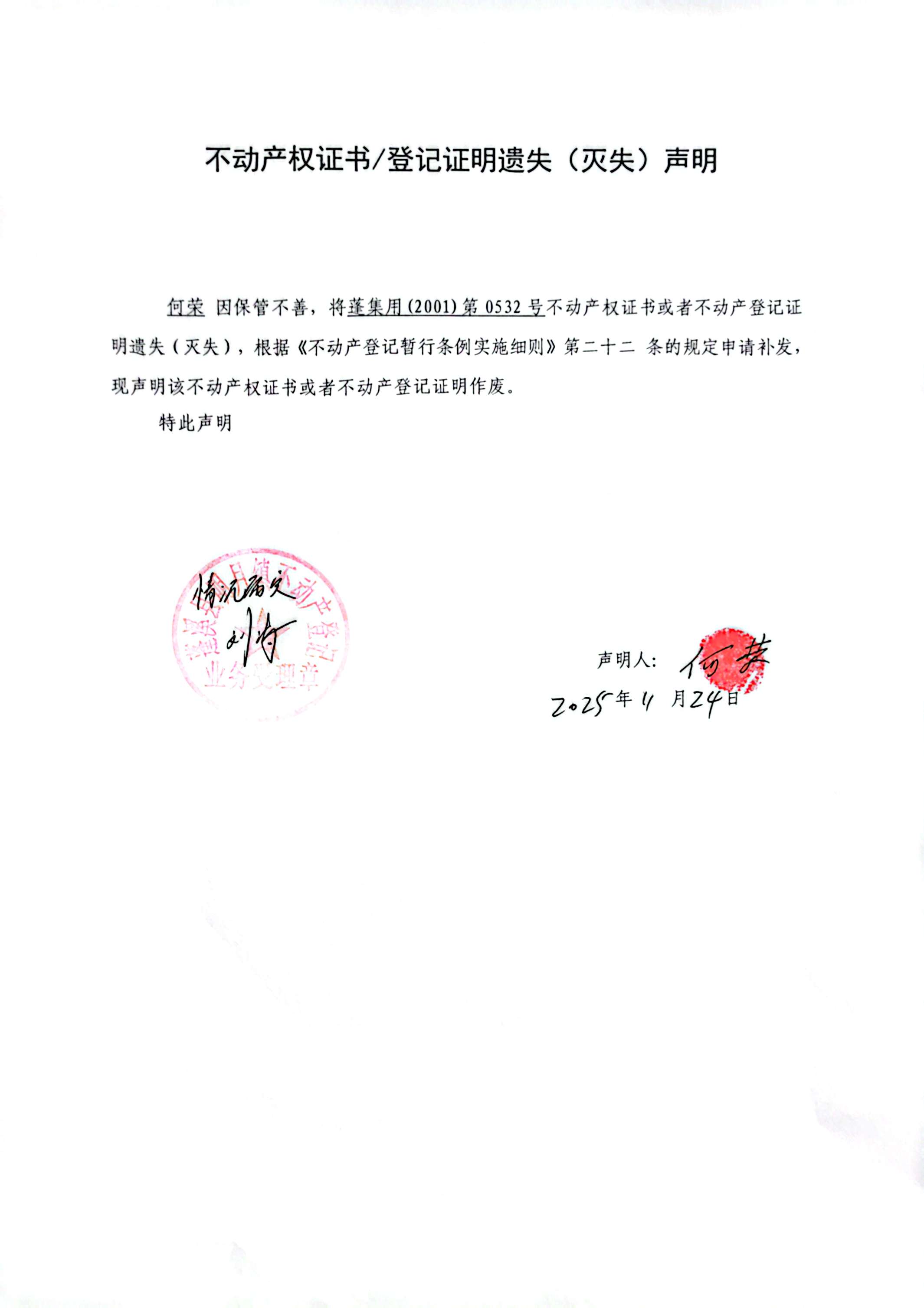 遗失补证登记公告(何荣)