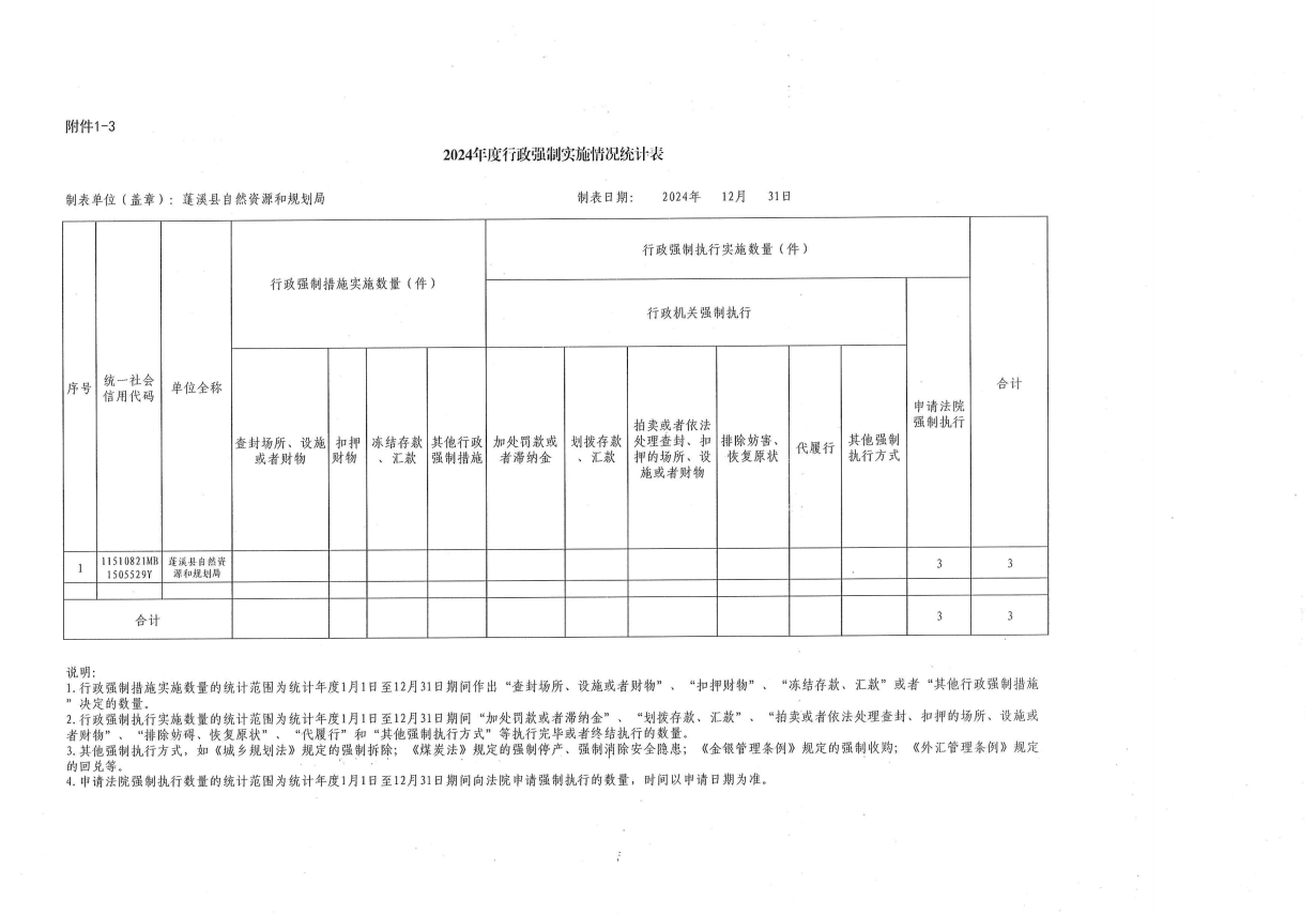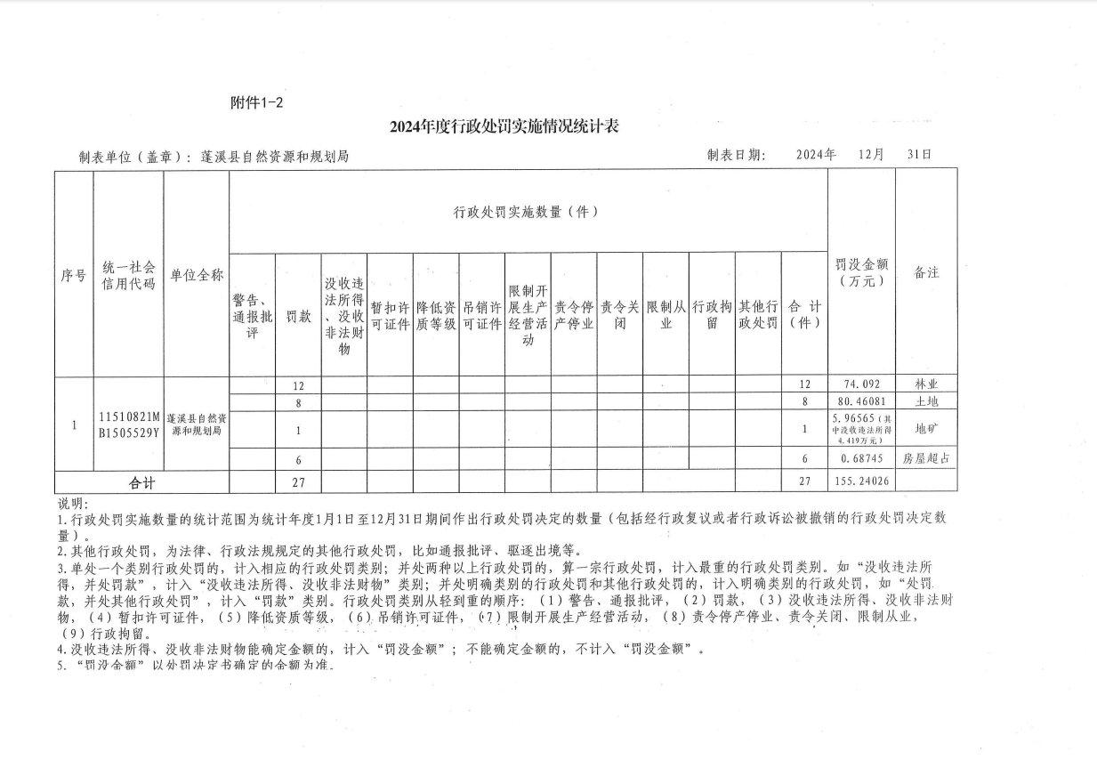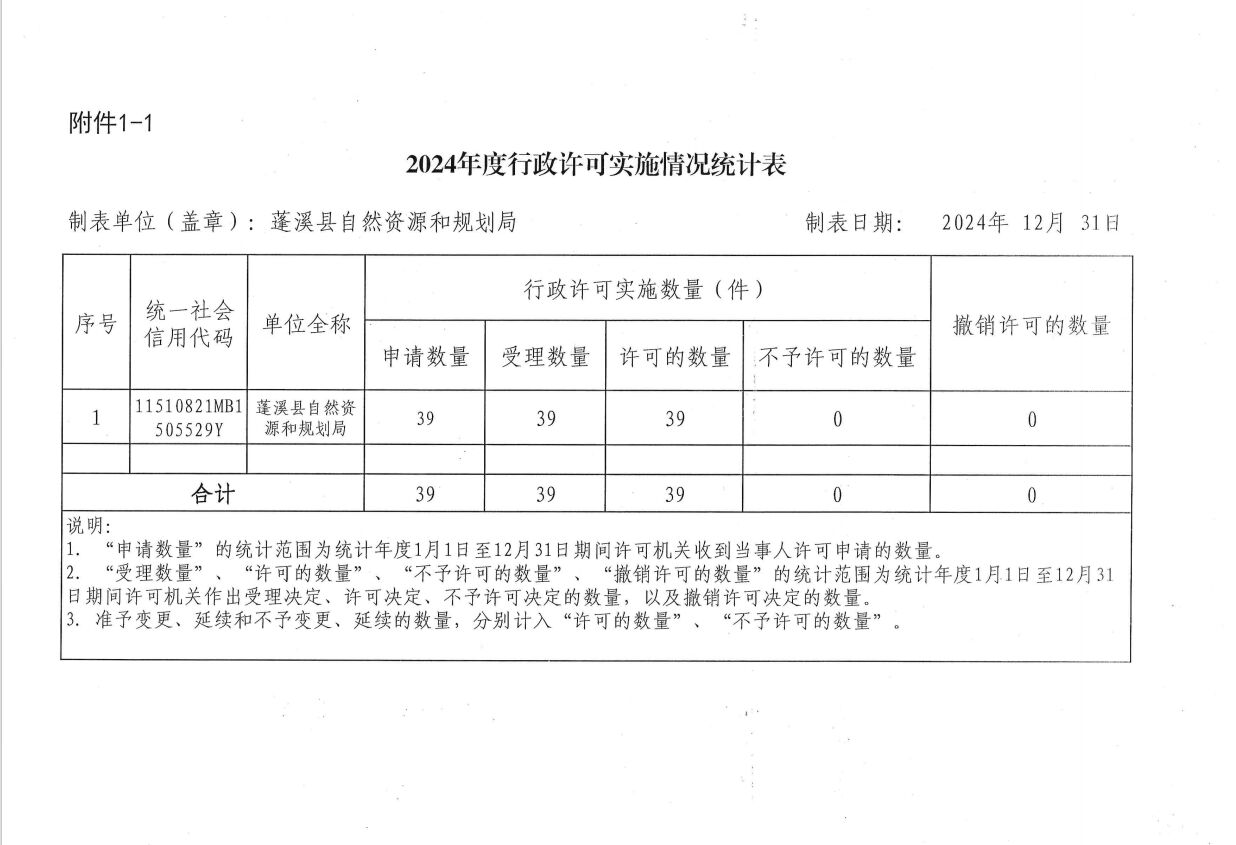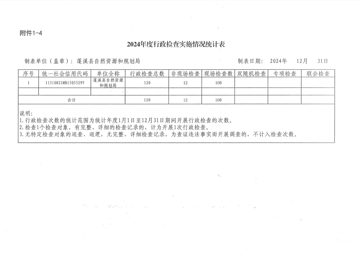 蓬溪县自然资源和规划局2024年度行政许可、行政处罚、行政强制、行政检查实施情况公示表