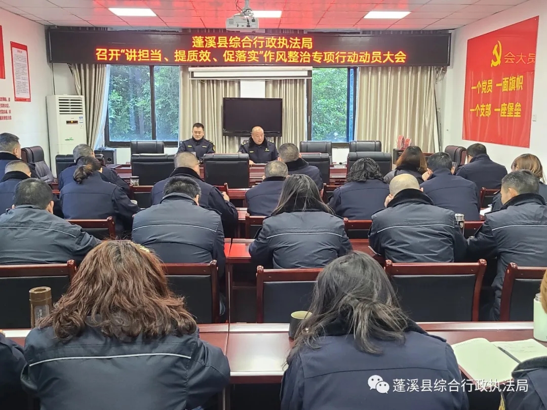 会议传达了12月17日县委召开的蓬溪县“讲担当、提质效、促落实”作风整治专项行动动员大会精神,学习了《蓬溪县“讲担当、提质效、促落实”作风整治专项行动实施方案》,安排部署了县综合执法局开展“讲担当、提质效、促落实”作风整治专项行动。