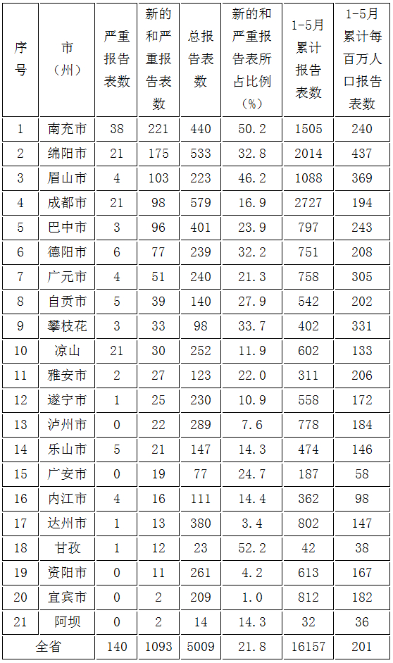 2014年5月四川省评价上报药品不良反应病例报告表5009份。其中新的和严重的病例报告表1093份,占21.8%,具体情况见下表: