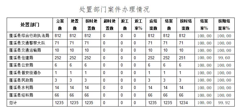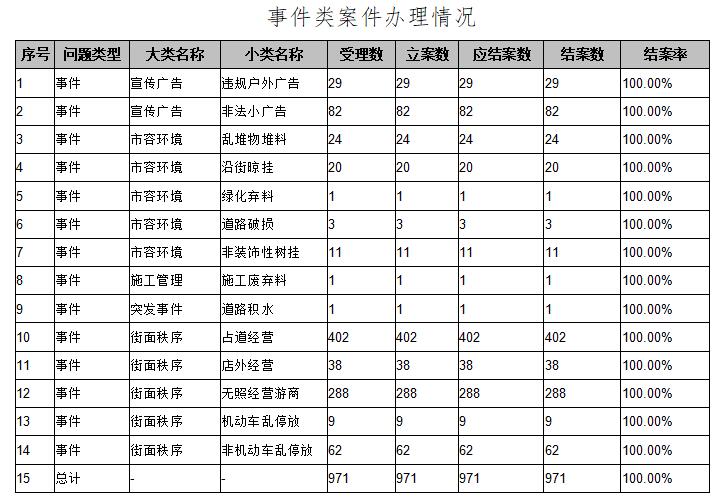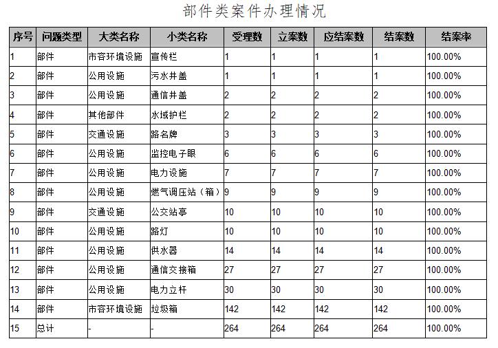 蓬溪县数字城管2022年9月共上报1739件。其中信息采集上报1243件,自行处置上报496件。立案1235件,事件类立案971件,部件类立案264件。应结案1235件,结案1235件,结案率100%,按期结案1234件,按期结案率99.92%。