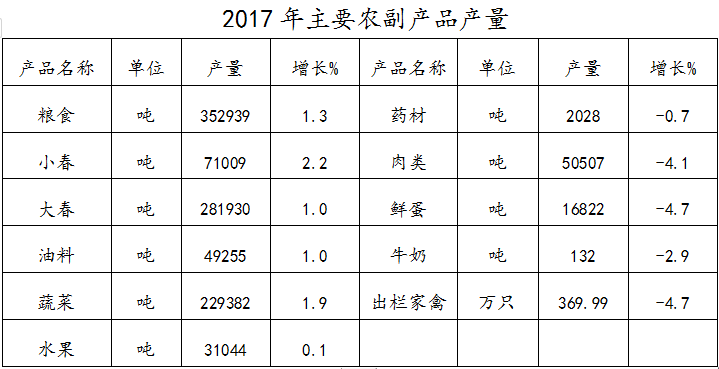 2017年全县以发展现代农业为重点,进一步加大各项惠农政策力度,扎实推进社会主义新农村建设,继续深化农业农村改革。全年实现农林牧渔业总产值547917万元,比上年增长3.5%。其中:农业产值(种植业)244091万元,增长4.4%;林业产值23373万元,增长4.9%;畜牧业产值244686万元,增长1.6%;渔业产值23249万元,增长6.6%; 农林牧渔服务业产值12518万元,增长13.5%。