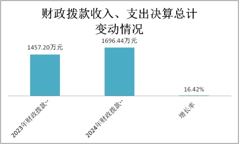 2024年度财政拨款收、支总计均为1696.44万元。与2023年度相比,财政拨款收、支出总计各增加239.24万元,增长16.42%。主要变动原因是本年度新增“之江高新搬迁改造项目专项法律服务费”、“法治示范创建奖补经费”、“法治宣传教育专项经费”项目。