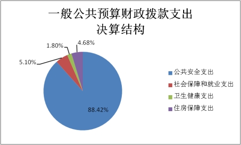 2024年度一般公共预算财政拨款支出1696.44万元,主要用于以下方面:公共安全(类)支出1499.93万元,占88.42%;社会保障和就业(类)支出86.61万元,占5.10%;卫生健康(类)支出30.47万元,占1.80%;住房保障(类)支出79.43万元,占4.68%。