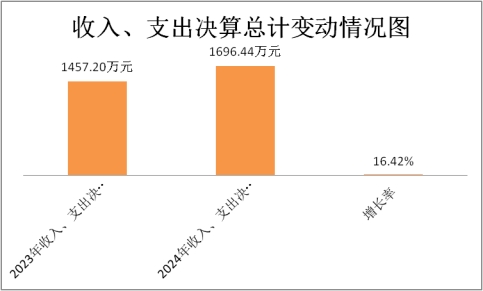 2024年度收、支总计均为1696.44万元。与2023年相比,收、支总计各增加239.24万元,增长16.42%。主要变动原因是本年度新增“之江高新搬迁改造项目专项法律服务费”、“法治示范创建奖补经费”、“法治宣传教育专项经费”项目。
