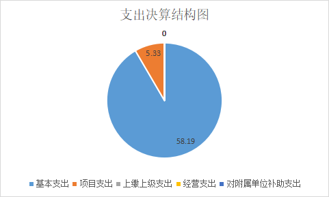 2023年度本年支出合计63.52万元,其中:基本支出58.19万元,占91.61%;项目支出5.33万元,占8.4%;上缴上级支出0万元,占0%;经营支出0万元,占0%;对附属单位补助支出0万元,占0%。