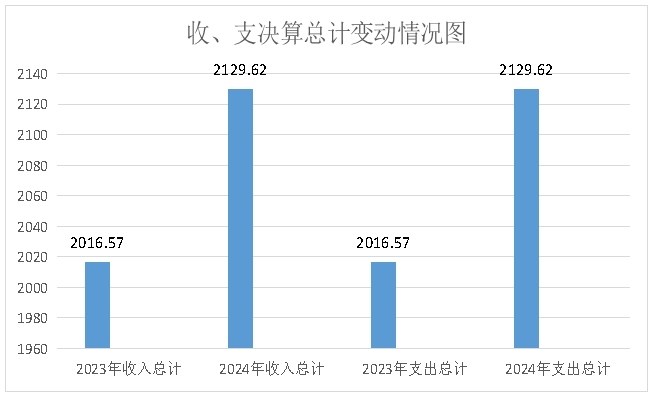2024年度收、支总计均为2129.62万元。与2023年度相比,收、支总计各增加113.05万元,增长5.6%。主要变动原因是:一般公共预算财政拨款收入增加;(图1:收、支决算总计变动情况图)