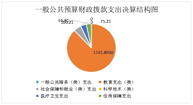 2024年度一般公共预算财政拨款支出1983.11万元,主要用于以下方面:一般公共服务支出0万元,占0%;教育支出1741.89万元,占87.84%;科学技术支出0万元,占0%;文化旅游体育与传媒支出0万元,占0%;社会保障和就业支出100.21万元,占5.05%;卫生健康支出75.21万元,占3.79%;住房保障支出65.81万元,占3.31%。