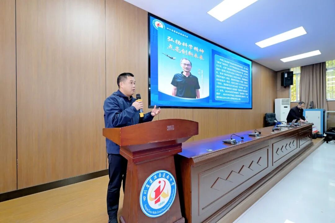 11月17日,蓬南中学教师会议室里掌声雷动,“弘扬科学精神 点亮创新未来”2025年遂宁市科学家科普宣讲活动在此隆重举行。中航工业成都飞机设计研究所研究员、歼-10B飞机试飞副总师卢克亲临现场,与蓬溪县科协唐利君部长、县教育局教育股谭绍祥及该校师生代表共赴一场科技盛宴。
