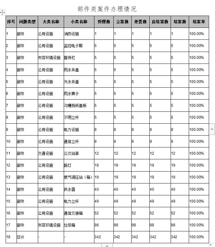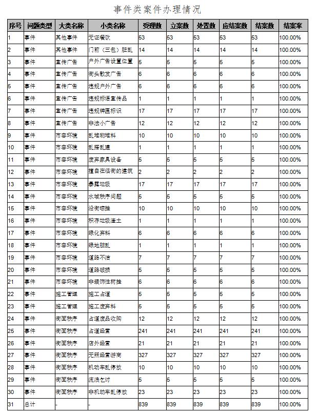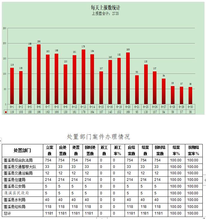 蓬溪县数字城管2023年6月共上报2735件。其中信息采集上报1185件,自行处置上报1550件。立案1181件,已处置1181件,处置率100%,应结案1181件,结案1181件,结案率100%,按期结案1181件,按期结案率100%。本月立案的事件类案件839件,主要集中在街面秩序、市容环境、宣传广告三大类;立案的部件类案件342件,主要集中在公用设施、市容环境设施、交通设施三大类。