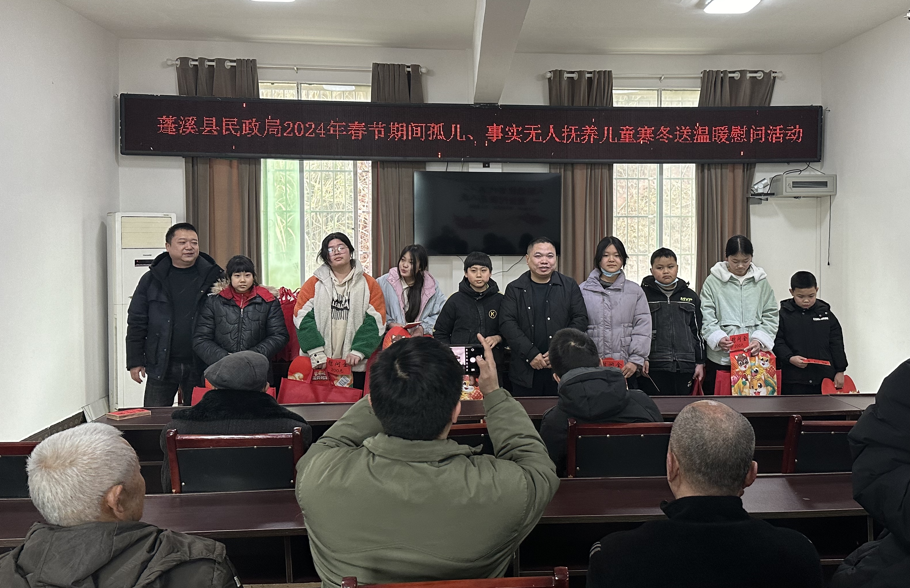 春节前夕,蓬溪县民政局扎实做好民生保障工作,全面关心关爱困难群众温暖过冬。一是切实保障好困难群众基本生活。截至目前,2月低保金、临时救助金、特困人员供养金、孤儿(事实无人扶养儿童)基本生活费、残疾人两项补贴等救助金已打卡发放到位。二是积极开展困难群众走访慰问活动。蓬溪县民政局印发了《2024年春节“走基层、送温暖”走访慰问活动工作方案》并下发到各乡镇,在全县范围内开展低保户、特困人员、留守老人、困境儿童等困难群众走访慰问活动,确保困难群众度过一个温暖祥和的春节,截至目前已慰问5125人,发放慰问金173.56万元。