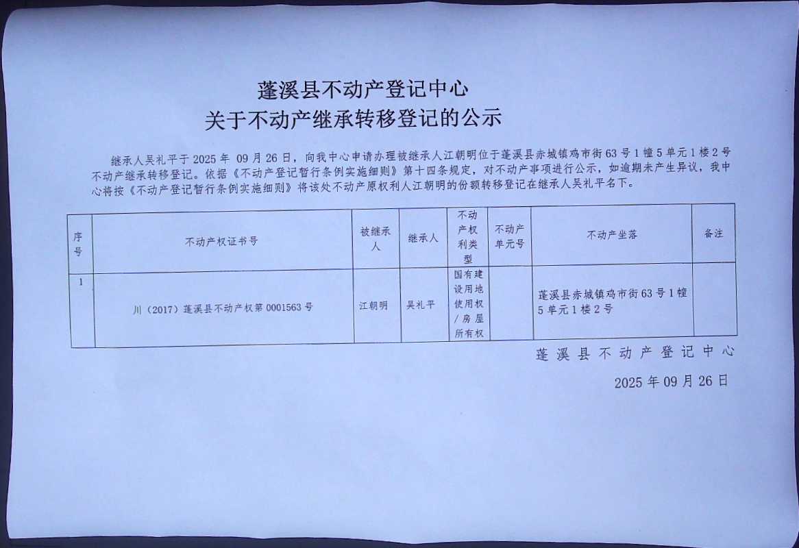 继承转移登记公告(吴礼平)