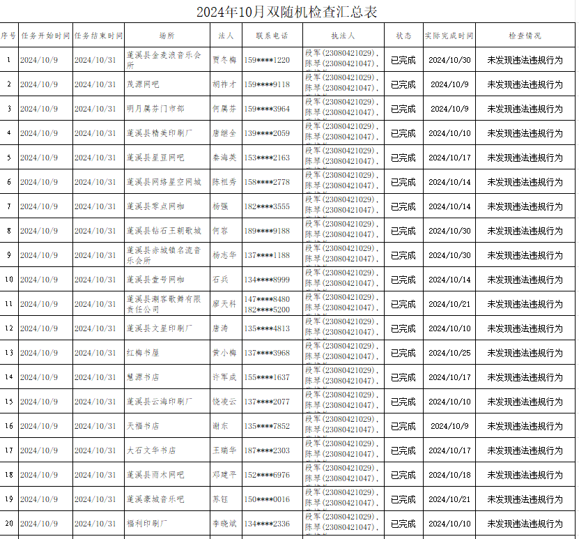 蓬溪县文化市场综合行政执法大队2024年10月双随机检查汇总表