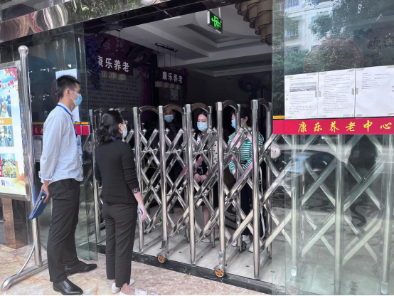 图为民政干部查看养老中心疫情防控和物资储备情况