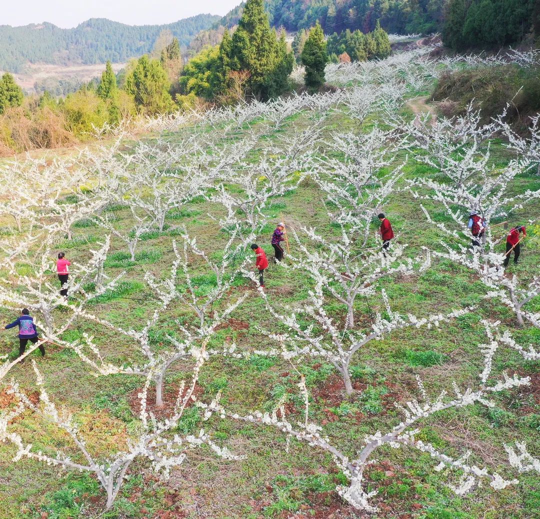 果园内,十余名村民一边唠着家常,一边忙着给果树除草松土。看着长势喜人的李树,村民喜上眉梢,因为这一棵棵果树就是大家的“发财树”“致富树”。