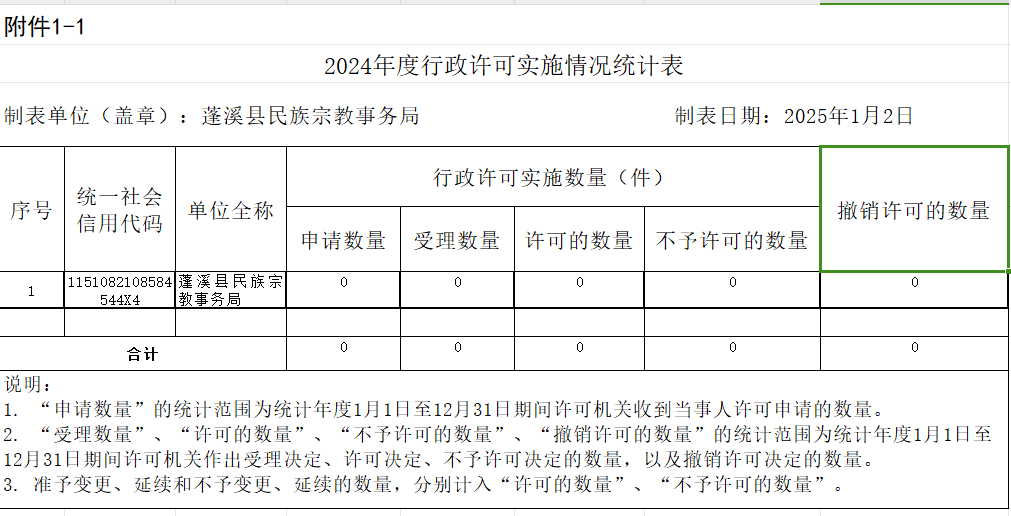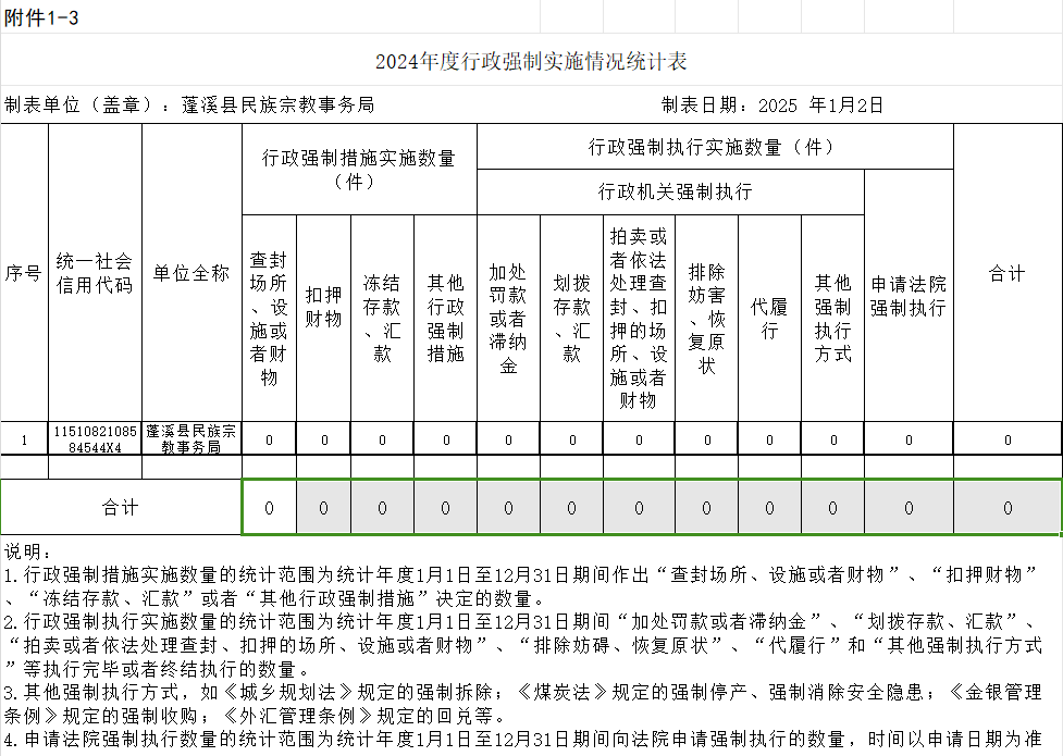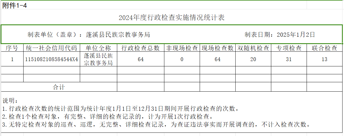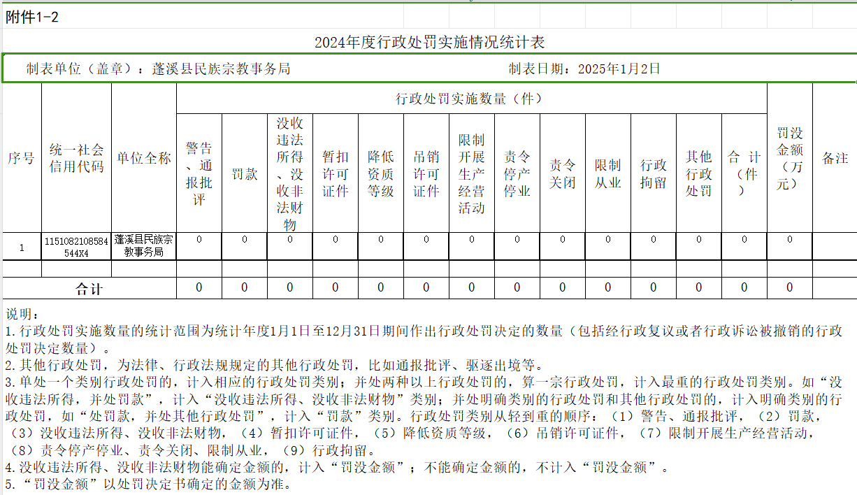 蓬溪县民族宗教事务局 2024年度行政许可、行政处罚、行政强制、行政检查实施情况统计公示表