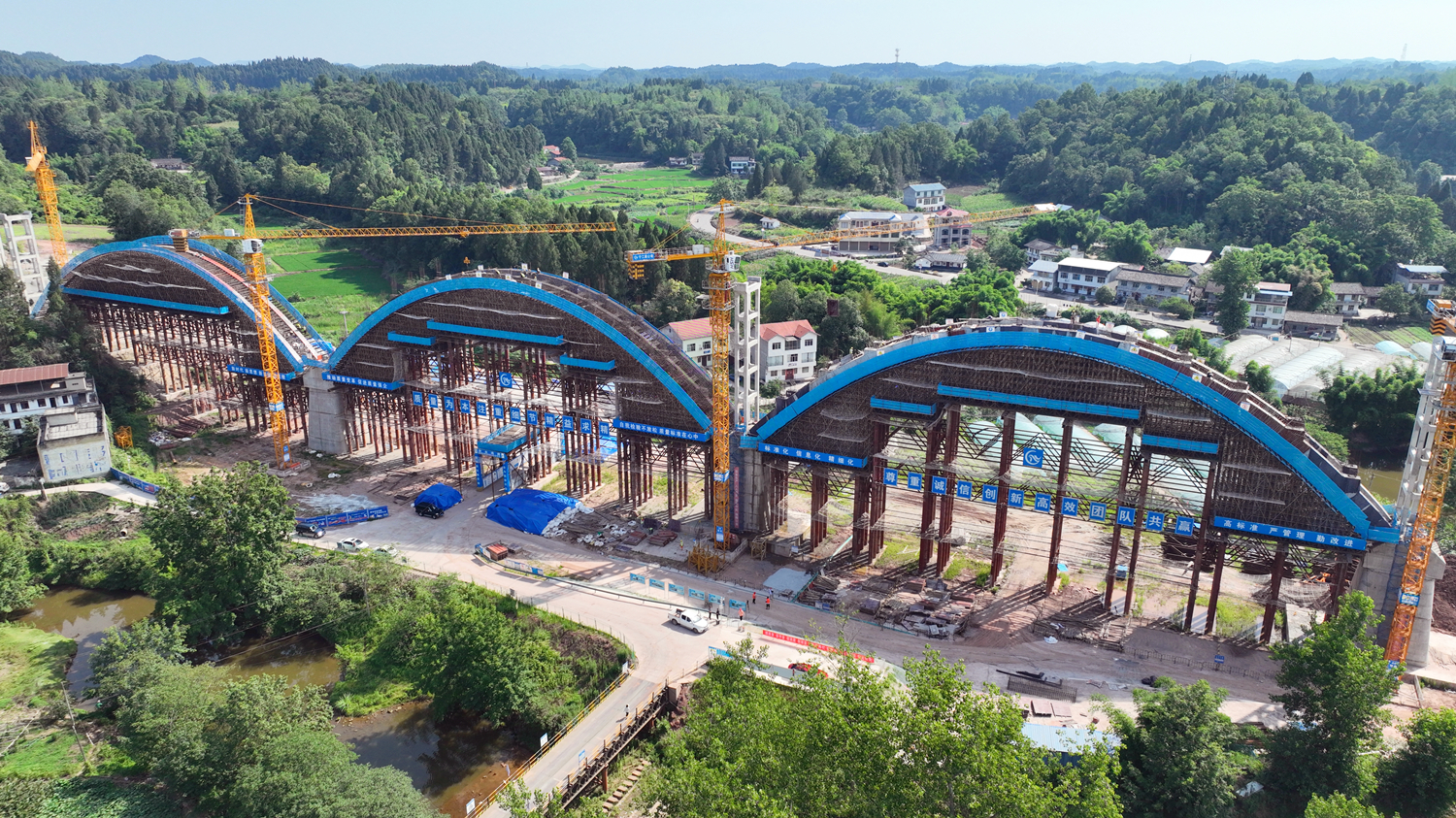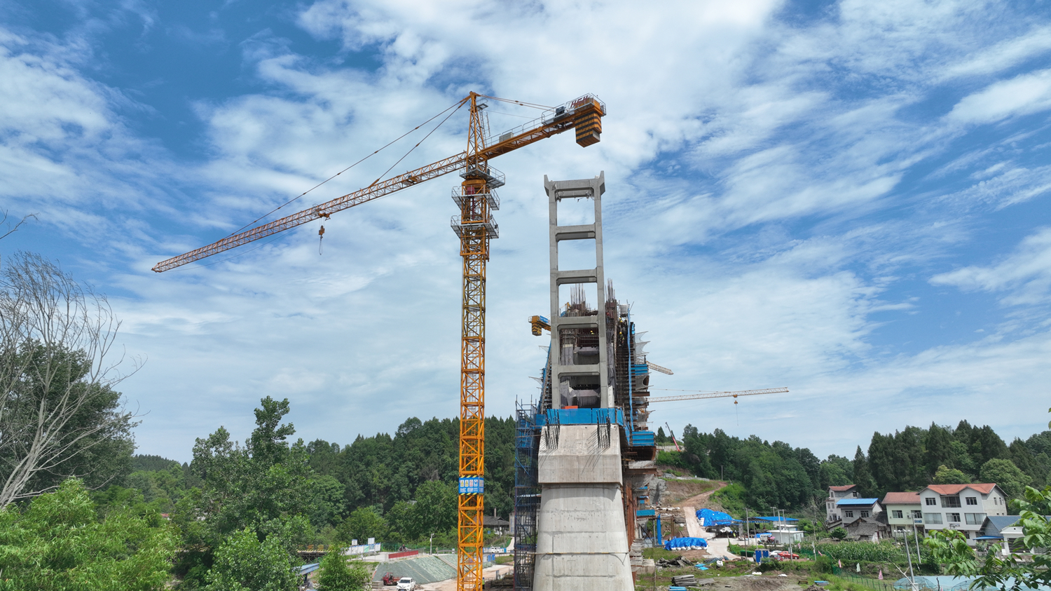 蓝天白云下,眼前的三连跨拱式渡槽拔地而起,十分壮观。田家祠渡槽长493.5米,渡槽最高处约50米。由于蓬船干渠田家祠渡槽工程所覆盖的地区属于嘉陵江和涪江的分水岭,地形以浅丘为主,这给施工带来一定难度。