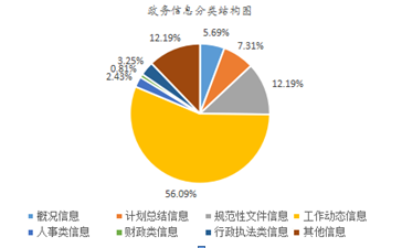 我们通过政府信息公开目录管理系统累计主动公开政府信息123条,其中,概况信息7条,占5.69%;计划总结信息9条,占7.31%;规范性文件信息15条,占12.19%;工作动态信息69条,占56.09%;人事类信息3条,占2.43%;财政类信息1条,占0.81%;行12.1912政执法类信息4条,占3.25%;其他信息15条,占12.19%。如图所示: