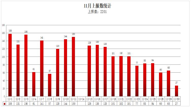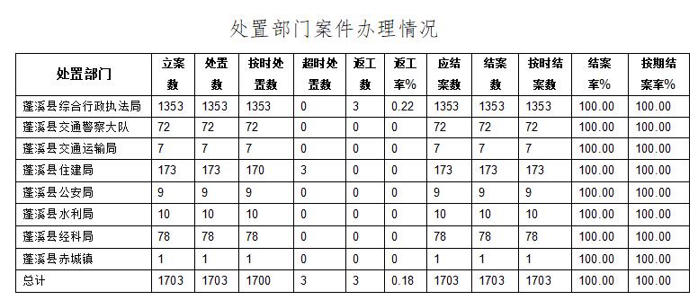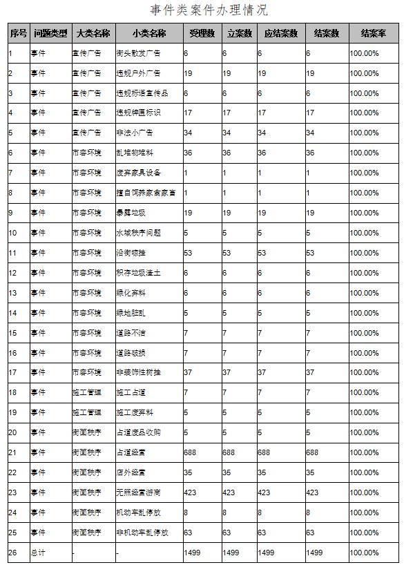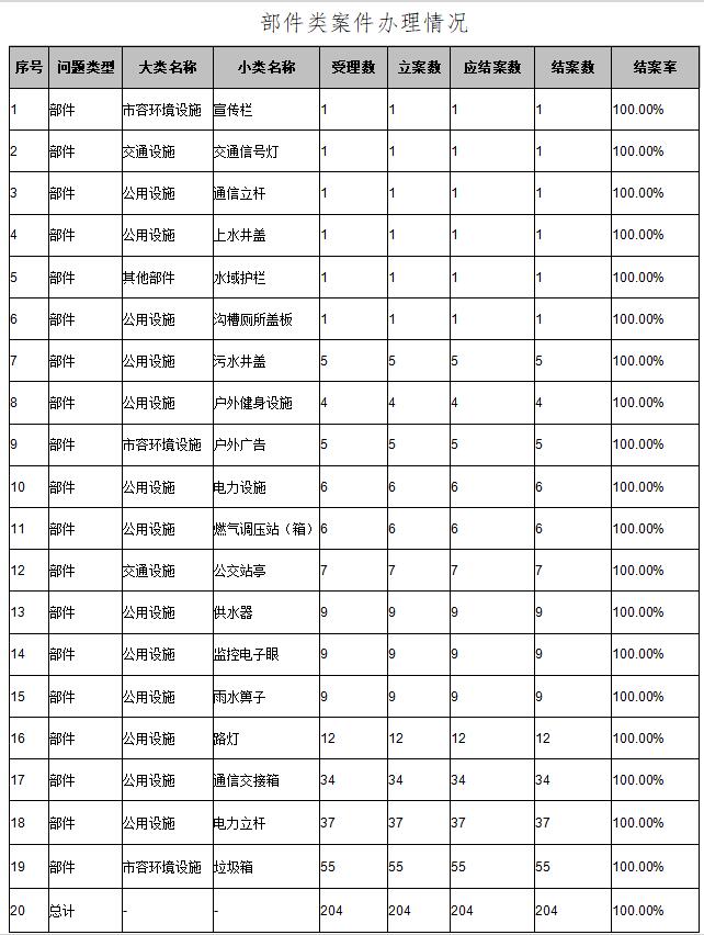 蓬溪县数字城管2022年11月共上报2201件。其中信息采集上报1711件,自行处置上报490件。立案1703件,事件类立案1499件,部件类立案204件。应结案1703件,结案1703件,结案率100%,按期结案1703件,按期结案率100%。