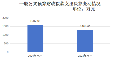 2024年度一般公共预算财政拨款支出1602.05万元,占本年支出合计的100%。与2023年度相比,一般公共预算财政拨款支出增加318.02万元,增长24.77%。主要变动原因是项目增加和人员变动。
