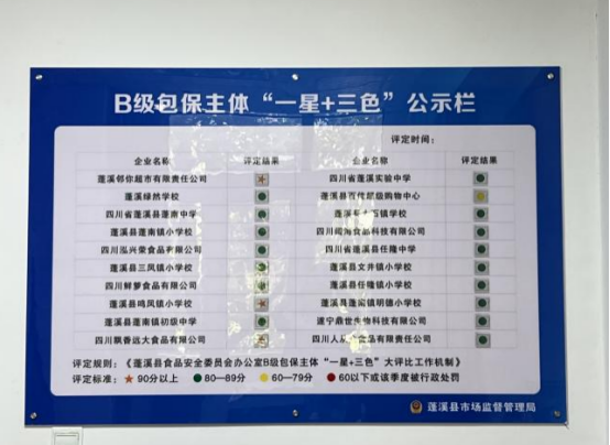 按照“集中攻坚、纵深推进、巩固提升”的工作思路,蓬溪县食安办建立《B级包保主体“一星+三色”大评比工作机制》,对全县20家B级主体开展“星级”和“红黄绿”三色监管,对“红色(处罚通报)企业”“黄色(黄牌警告)企业”相应提高监管频次。每季度公示评比结果,揭榜竞优,为市场主体注入活力,为严格各级包保主体落实企业主体责任打下基础。