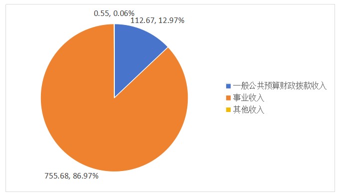 2024年度本年收入合计868.91万元,其中:一般公共预算财政拨款收入112.67万元,占12.97%;事业收入755.68万元,占86.97%;其他收入0.55万元,占0.06%。