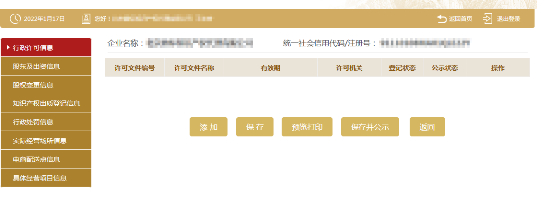 企业若办理有行政许可证的(例如危化品经营许可证,食品流通许可证等),在登录进入年报系统后,须点击“其它自行公示信息”,进入填写页面,点击“行政许可信息”,按照模板内容填写后点击保存,并点击“提交并公示”。