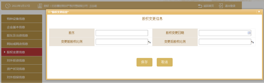 7、填写股权变更信息,点击左边的“股权变更信息”,之后再点击“保存”如未发生过股权变更的则无需填写此项信息。